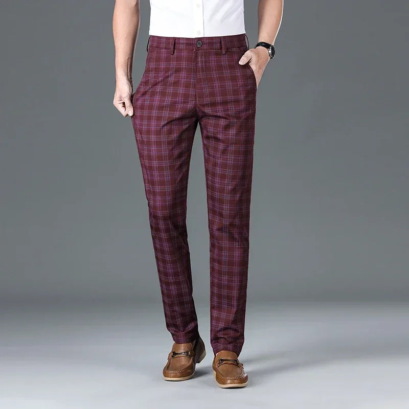 Slim Checkered Pants, Stretch Straight Business Casual Trousers