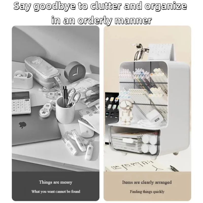 Double layered multifunctional design: top open storage+bottom drawer, balancing the storage and retrieval of commonly used stationery with hidden storage of miscellaneous items